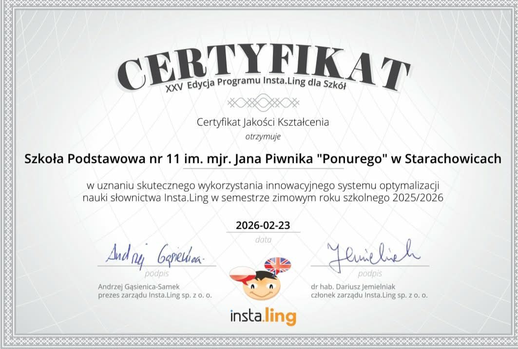 W naszej szkole naukę słówek w języku angielskim na platformie Insta.Ling realizują od początku roku szkolnego grupy zaawansowane klas 4ai i 4b, 5a, 5b, 6ai i 6b pod kierunkiem anglistek p. Magdaleny Sławskiej-Opozda i p. Marleny Przepióry. Pragniemy poinformować, że Nasza Szkoła otrzymała Certyfikat Jakości Kształcenia XXV Edycji Programu Insta.Ling dla Szkół za skuteczne wykorzystanie innowacyjnego systemu nauki słownictwa Insta.Ling w semestrze zimowym roku szkolnego 2025/2026.