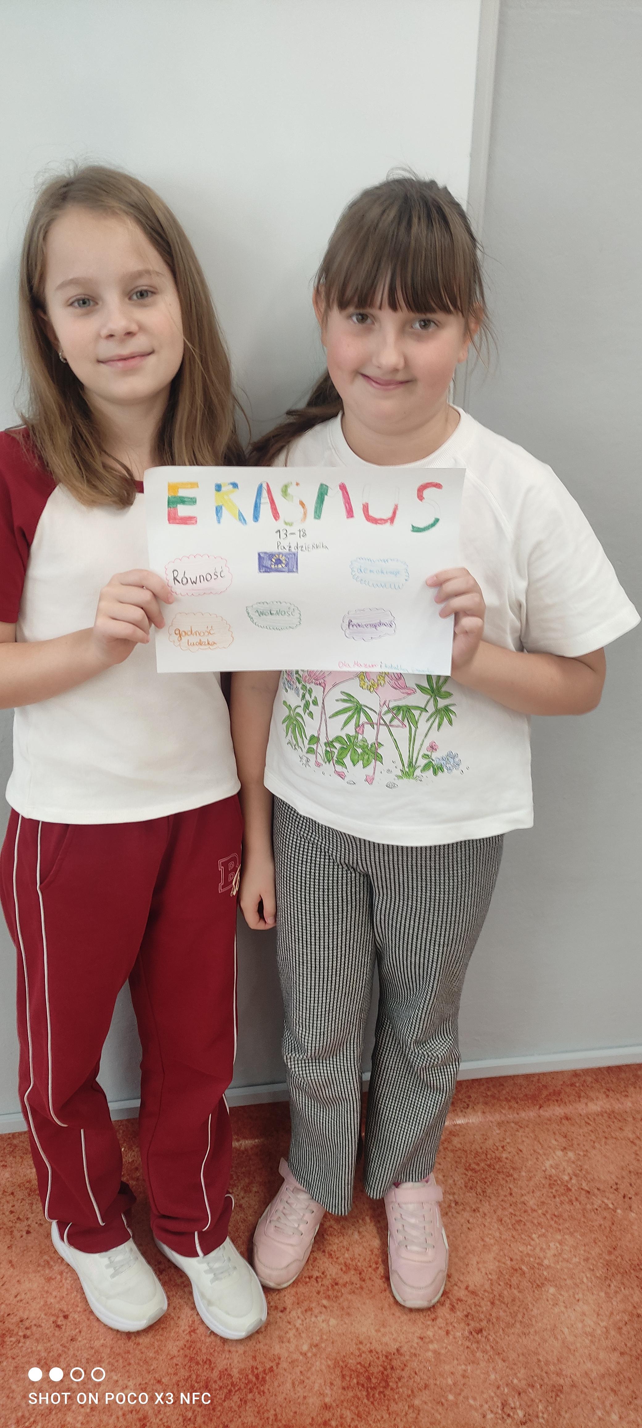 Uczniowie klas czwartych aktywnie włączyli się w obchody Erasmus Days. Podczas lekcji języka angielskiego obejrzeli prezentację poświeconą wartościom, na których opiera się Unia Europejska: poszanowaniu godności ludzkiej, wolności, demokracji, praworządności i prawom człowieka. Następnie zaprojektowali plakaty i prace plastyczne promujące poszczególne wartości europejskie. Rozwiązywali także zagadki związane z historią i wartościami UE. Była to lekcja szacunku, otwartości i odpowiedzialności za nasze wspólne dobro.