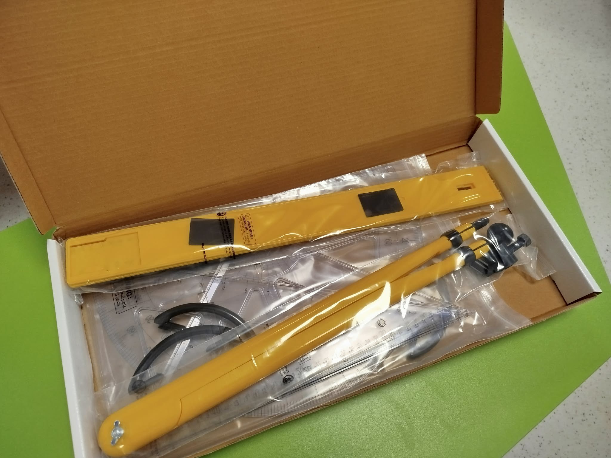 W zeszły tygodniu dotarła kolejna paczka z nagrodami za Talenciaki. Jest to zestaw trygonometryczny do tablicy: linijka o długości 100 cm, dwie ekierki, cyrkiel i kątomierz. Na pewno przydadzą się na zajęciach matematyki