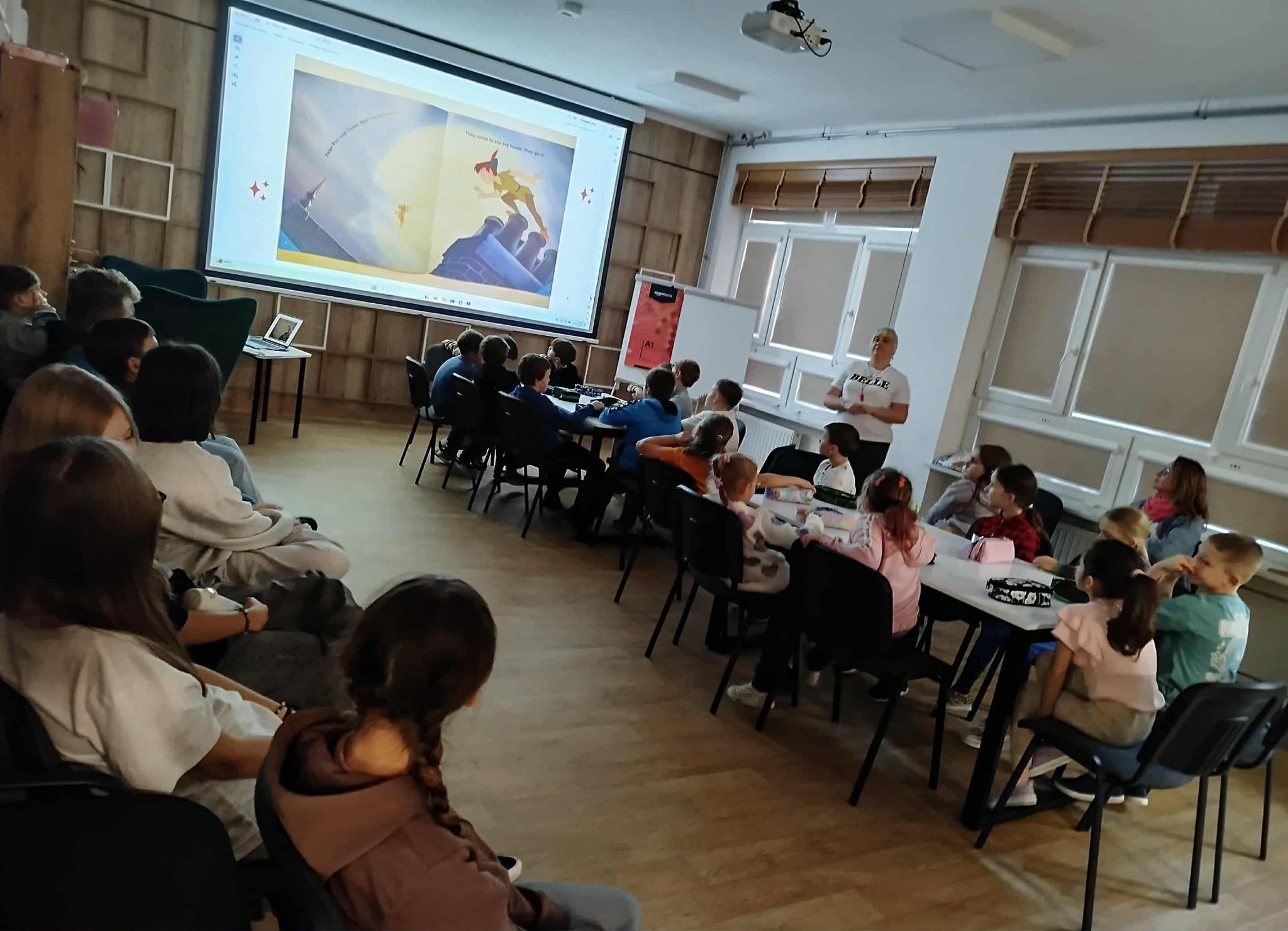 Z okazji Międzynarodowego Dnia Postaci z Bajek, który przypada na 5 listopada uczniowie z klasy 2a i 6ai z gr. zaaw. spotkali się przy bajce "Peter Pan comes to London". Wspólnie obejrzeli prezentację, starsi uczniowie przeczytali młodszym bajkę w wersji angielskiej, a następnie przystąpili do wykonywania nie tylko ćwiczeń leksykalnych, ale także stworzyli mapy Nibylandii. Nad wszystkim czuwały panie Magdalena Sławska-Opozda, Justyna Adach i Anna Stępień. Zajęcia miały za zadanie zainicjowanie współpracy między uczniami grup innowacyjnych z różnych poziomów edukacyjnych i będą miały charakter cykliczny.