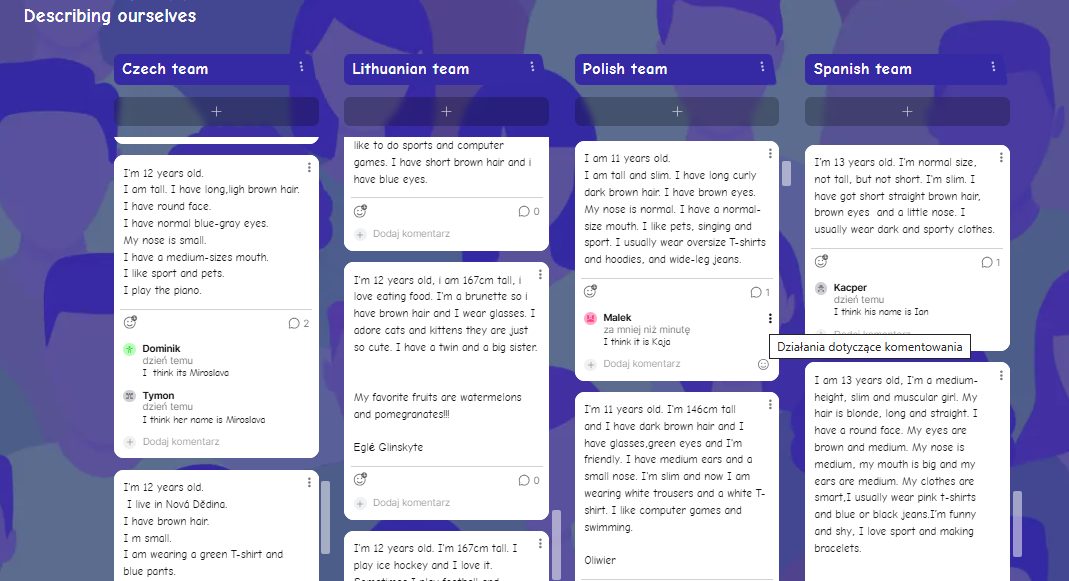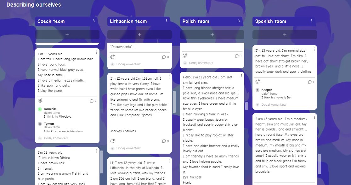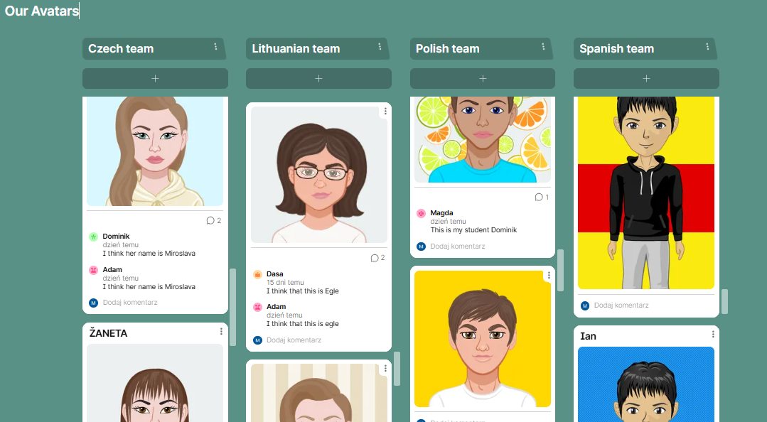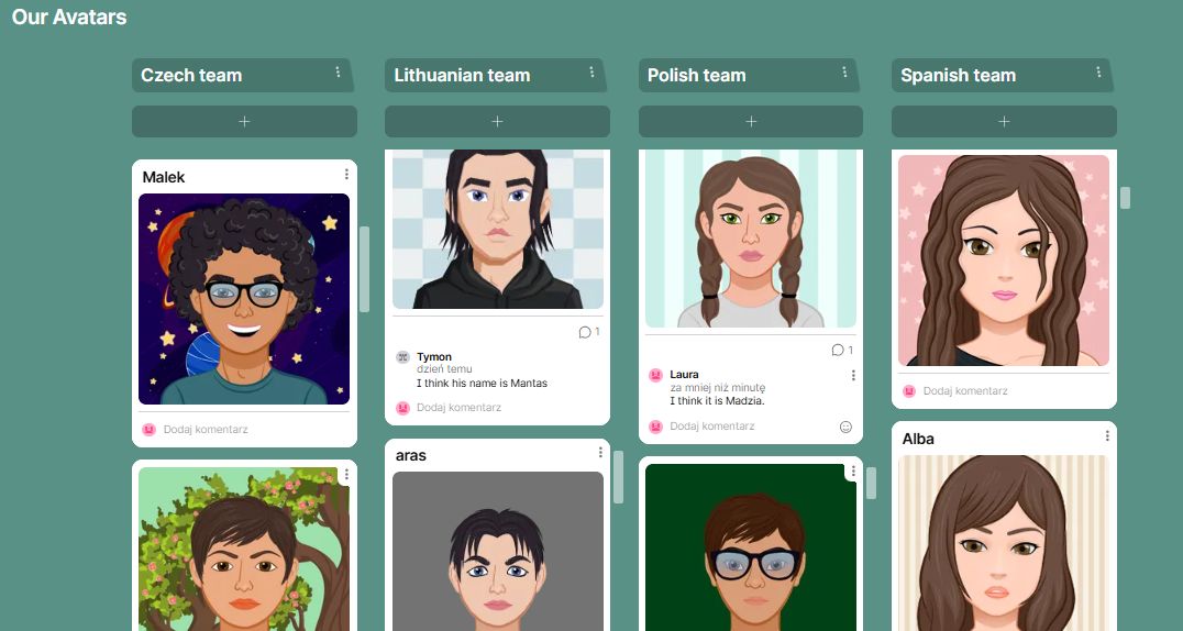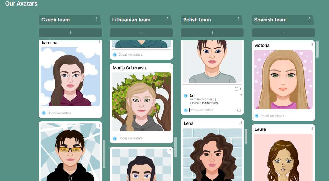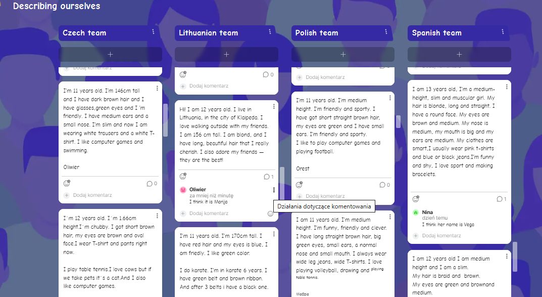 Na przełomie października i listopada uczniowie z grup zaawansowanych z klas 5a i 5b zaczęli pracę z projektem eTwinning razem ze swoimi rówieśnikami z Czech, Hiszpanii i Litwy. Ich zadaniem było przedstawienie siebie (krótki opis po angielsku) oraz stworzenie swoich avatarów na padletach - wirtualych tablicach, a następnie musieli dopasować opisy rówieśników do ich avatarów, albo avatary do ich opisu. Uczniowie dowiedzieli się o sobie nie tylko jak wyglądają, ale także co lubią i jakie mają zainteresowania. Wszystkie prace uczniów zostały zamieszczone na roboczej platformie Twinspace. Well done my stydents!