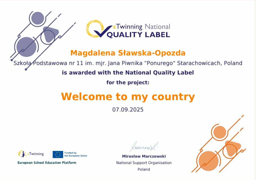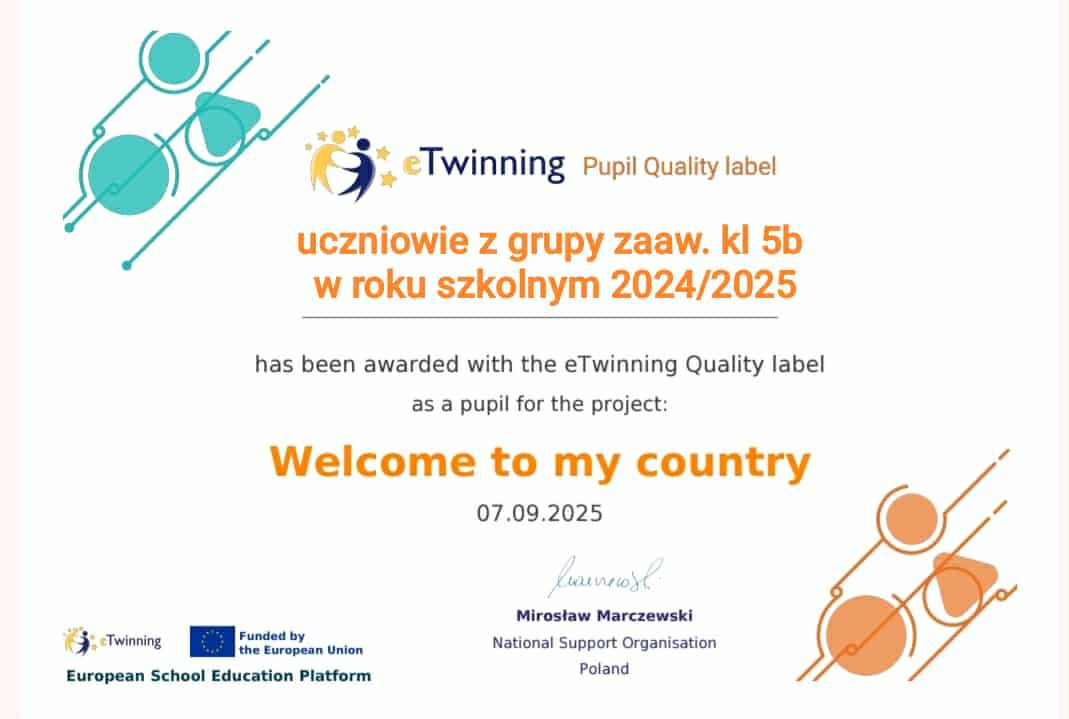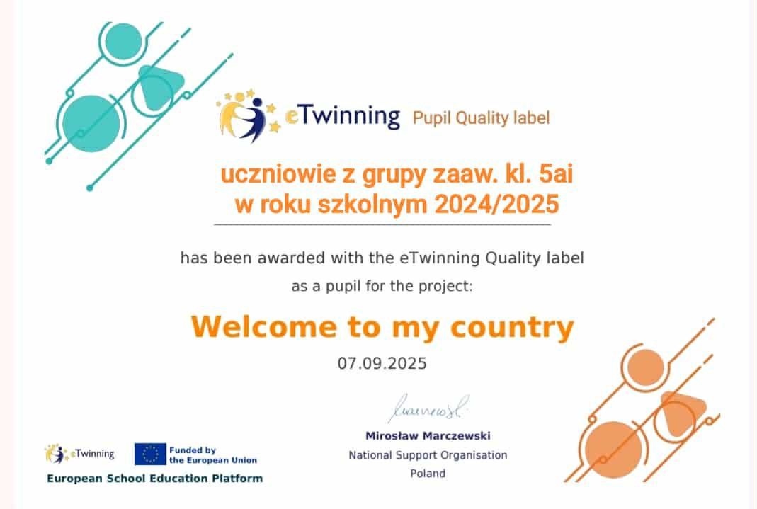 Miło nam poinformować, że otrzymaliśmy Krajową Odznakę Jakości za międzynarodowy projekt eTwinning "Welcome to my country", który był realizowany w roku szkolnym 2024/2025 przez następujących uczniów: Maja Bańcerowska, Michał Dula, Liwia Goluch, Antoni Kasprzyk, Nadia Kędziora, Maja Kołodziejczyk, Maja Lewandowska, Lena Pacek, Oliwia Pawlik, Alan Sikora, Hanna Tomczak, Dominik Wolf, Antoni Wójcicki, Pola Zieja, Dominika Dyk, Michał Dziułka, Wiktoria Hyc, Wiktor Kwiatkowski, Mateusz Olczyk, Jakub Śpiewak, Lena Węgrzyn i Dominik Wypchło.