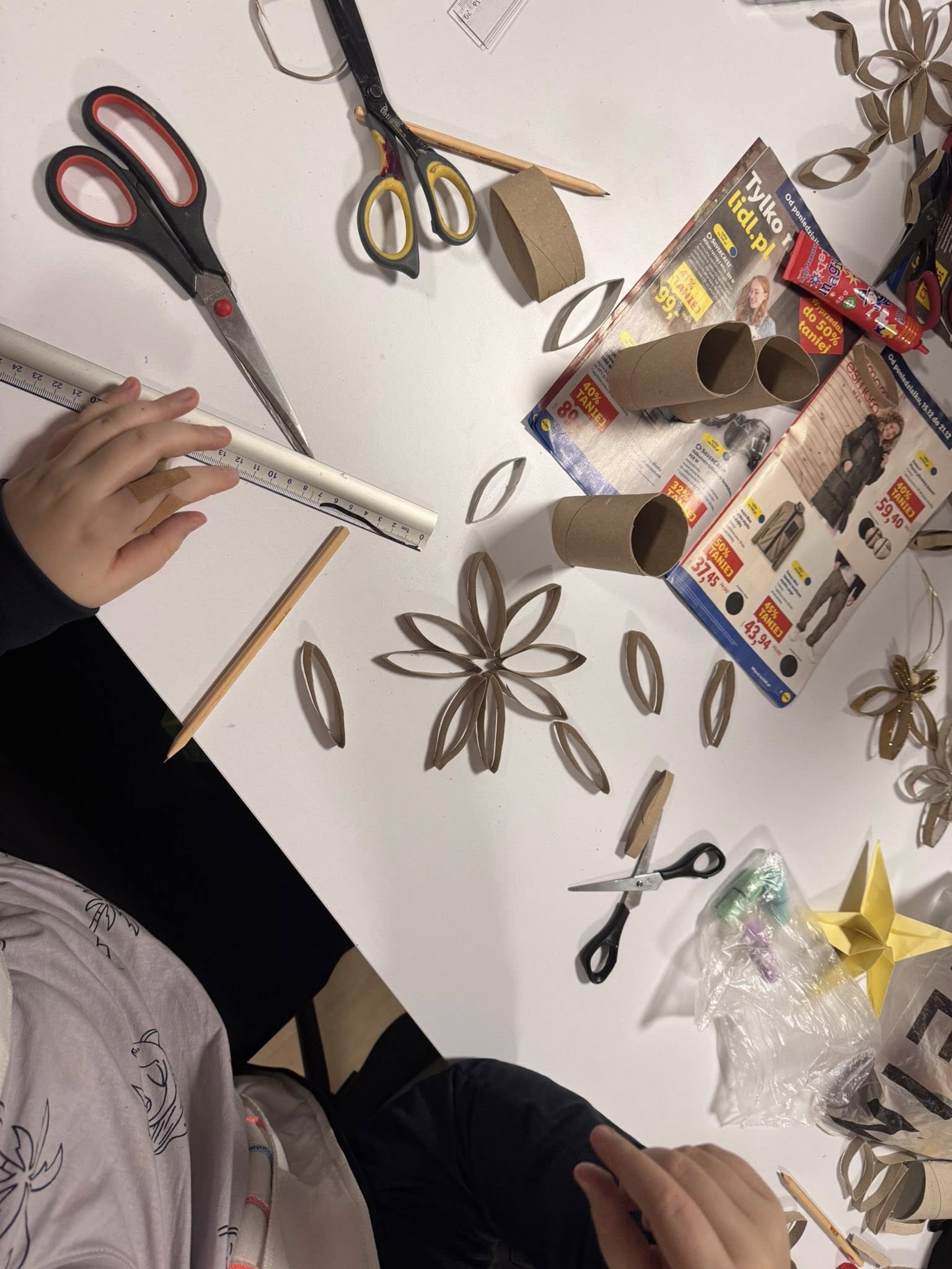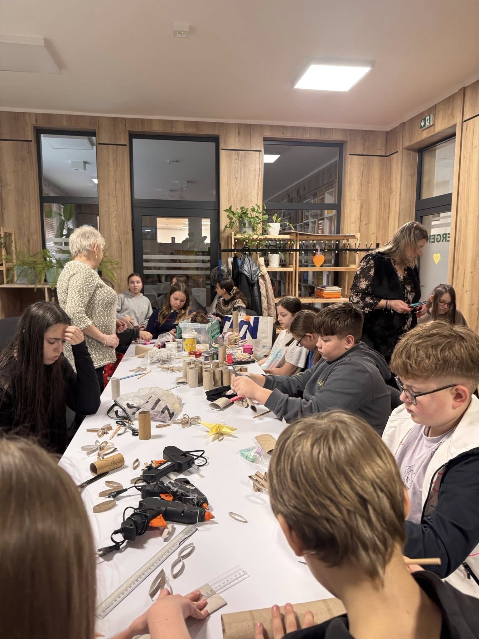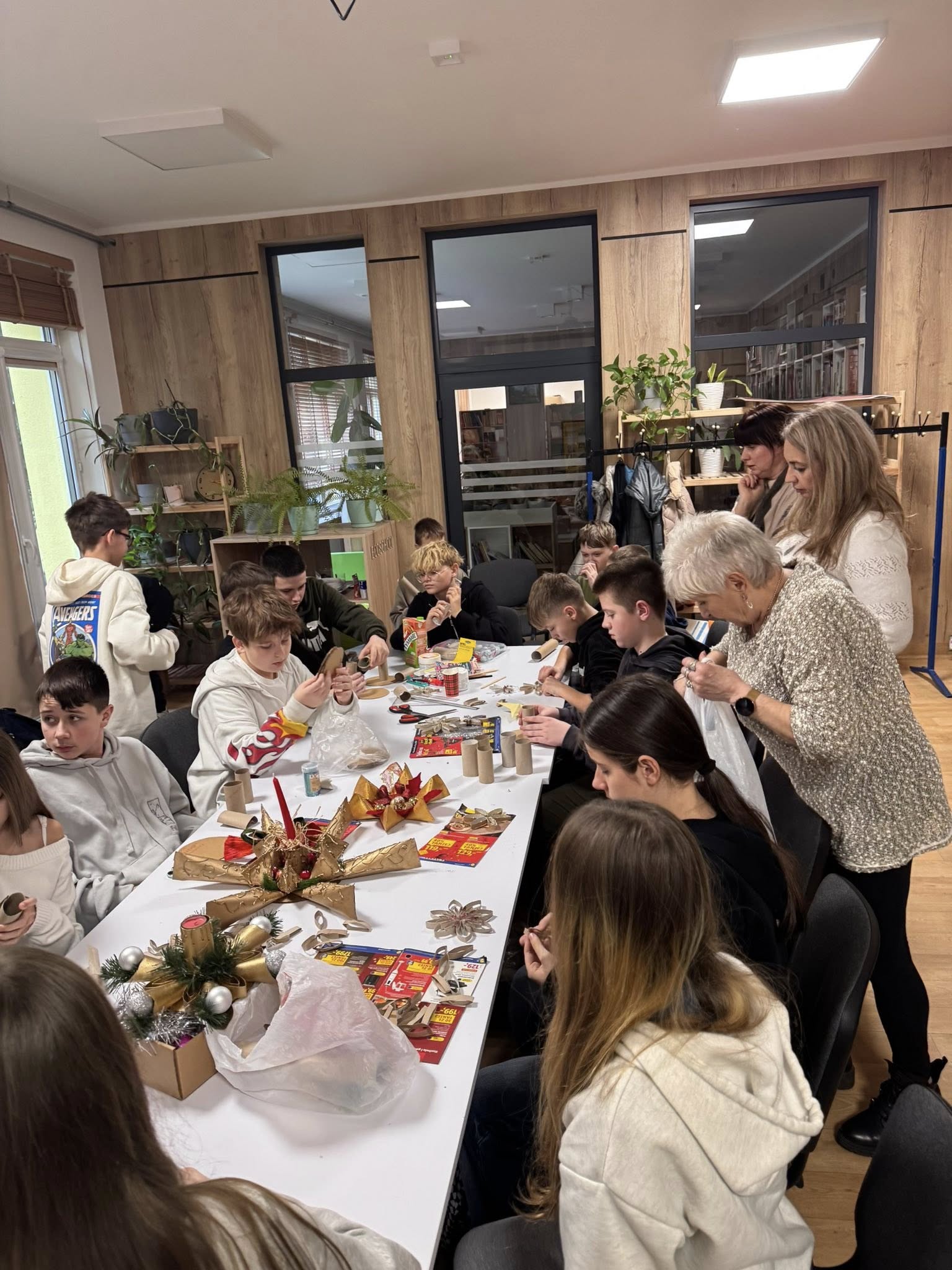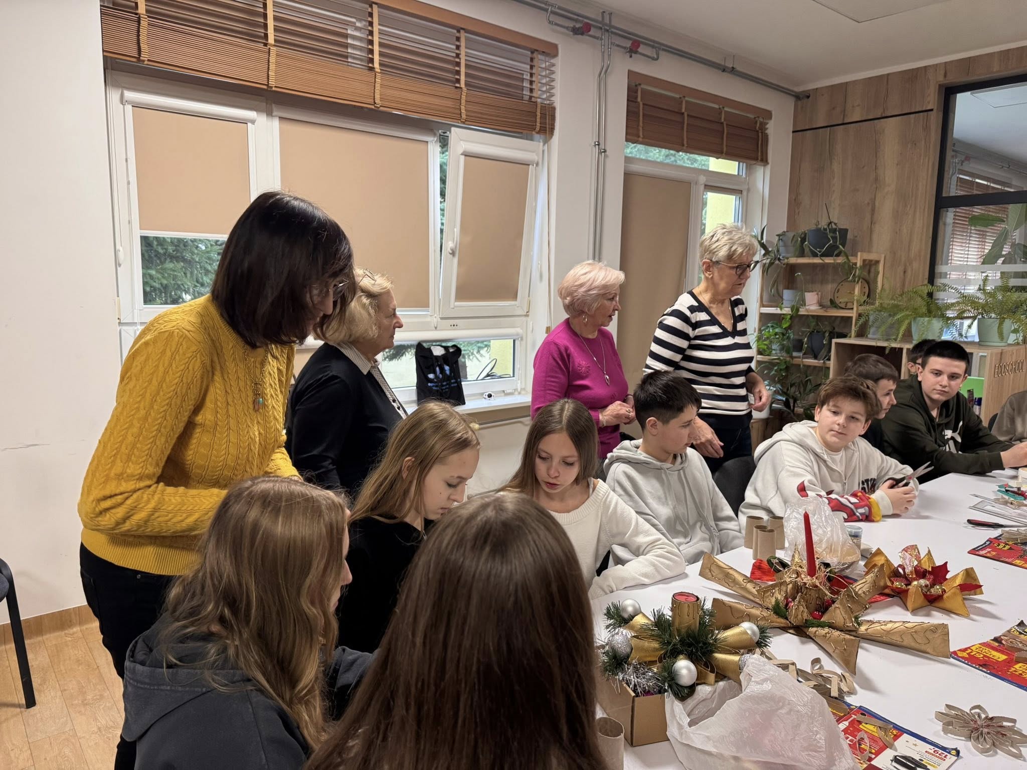 Wczoraj uczniowie klas: 6b i 7b, a dziś 5b i 1a tworzyli przepiękne stroiki i ozdoby świąteczne z surowców wtórnych. Wykorzystywali rolki po ręcznikach papierowych, papierze toaletowym, sznurki, papier i oczywiście różnego rodzaju ozdoby. Nie byłoby to możliwe, gdyby nie pomoc członkiń zaprzyjaźnionej sekcji „Niespokojne ręce” z Uniwersytetu Trzeciego Wieku ze Starachowic z panią Joanną Wójcik na czele. Panie przyjęły zaproszenie naszej wicedyrektor szkoły Agnieszki Pachockiej na wspólne warsztaty tworzenia ekoozdob świątecznych. Podczas tej niezwykłej lekcji ekologii, połączonej z tradycjami bożonarodzeniowymi panowała niezwykle miła i twórcza atmosfera. Uczniowie chętnie uczestniczyli w zajęciach, które tym razem nie były prowadzone przez nauczyciela naszej szkoły, ale przez niezwykle utalentowane słuchaczki UTW.