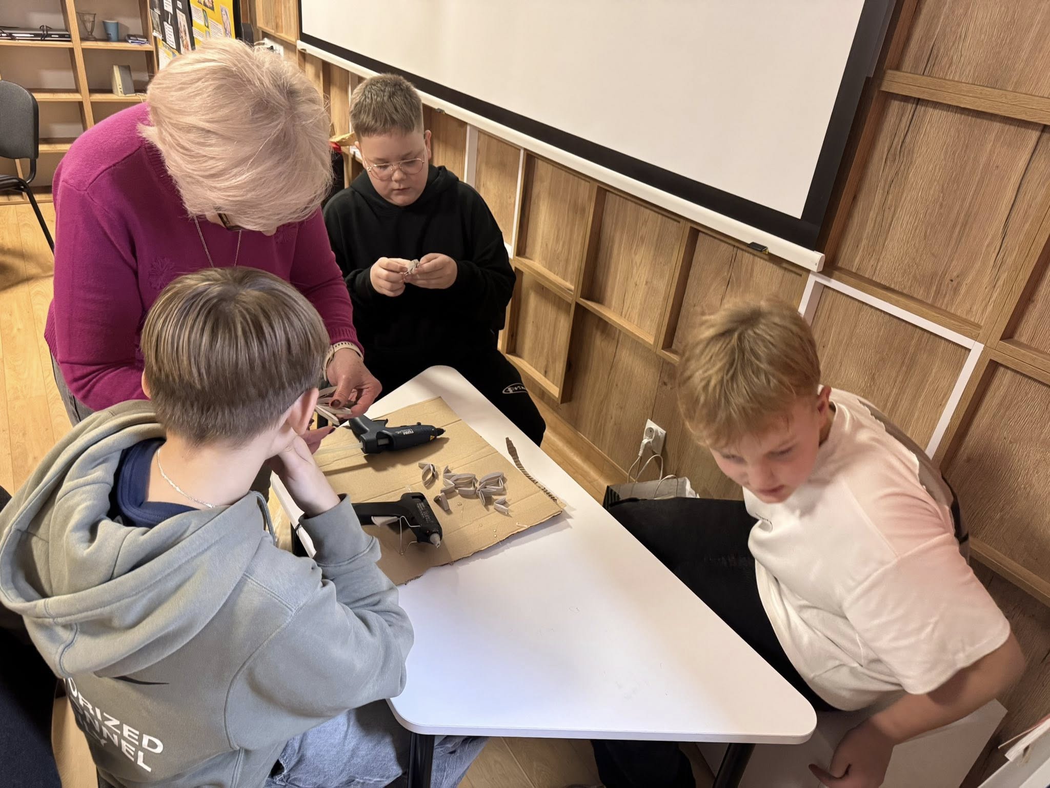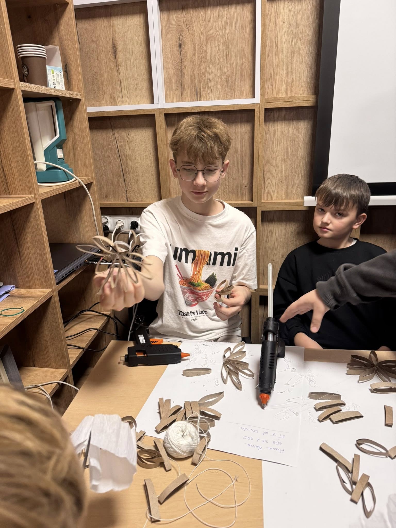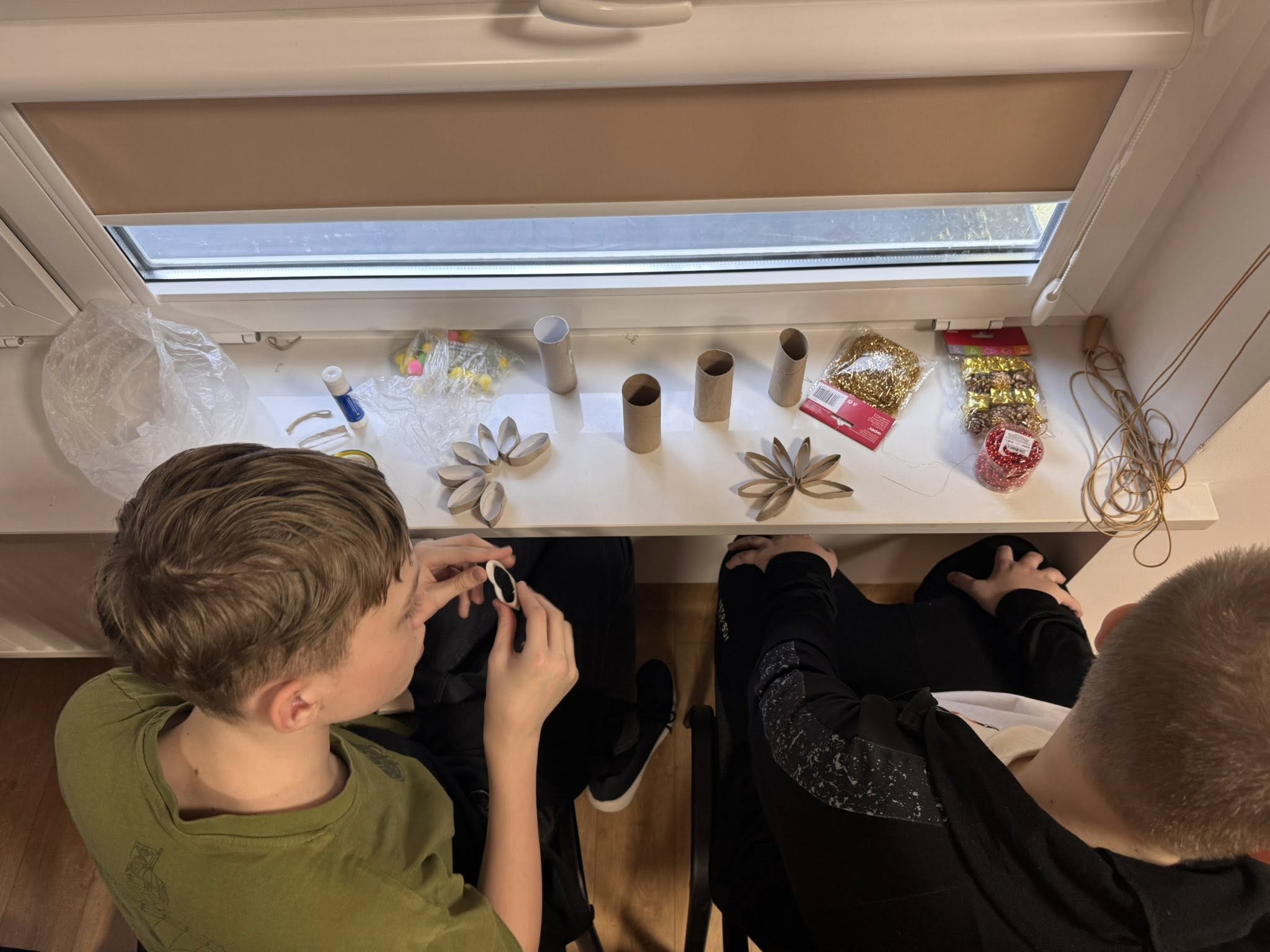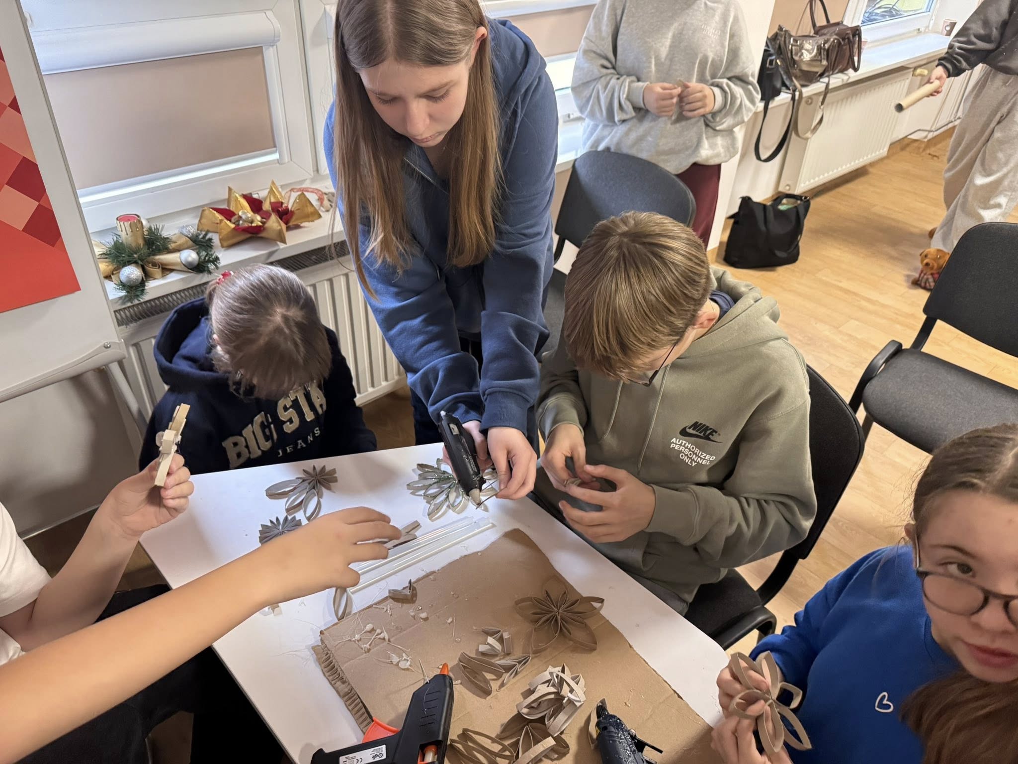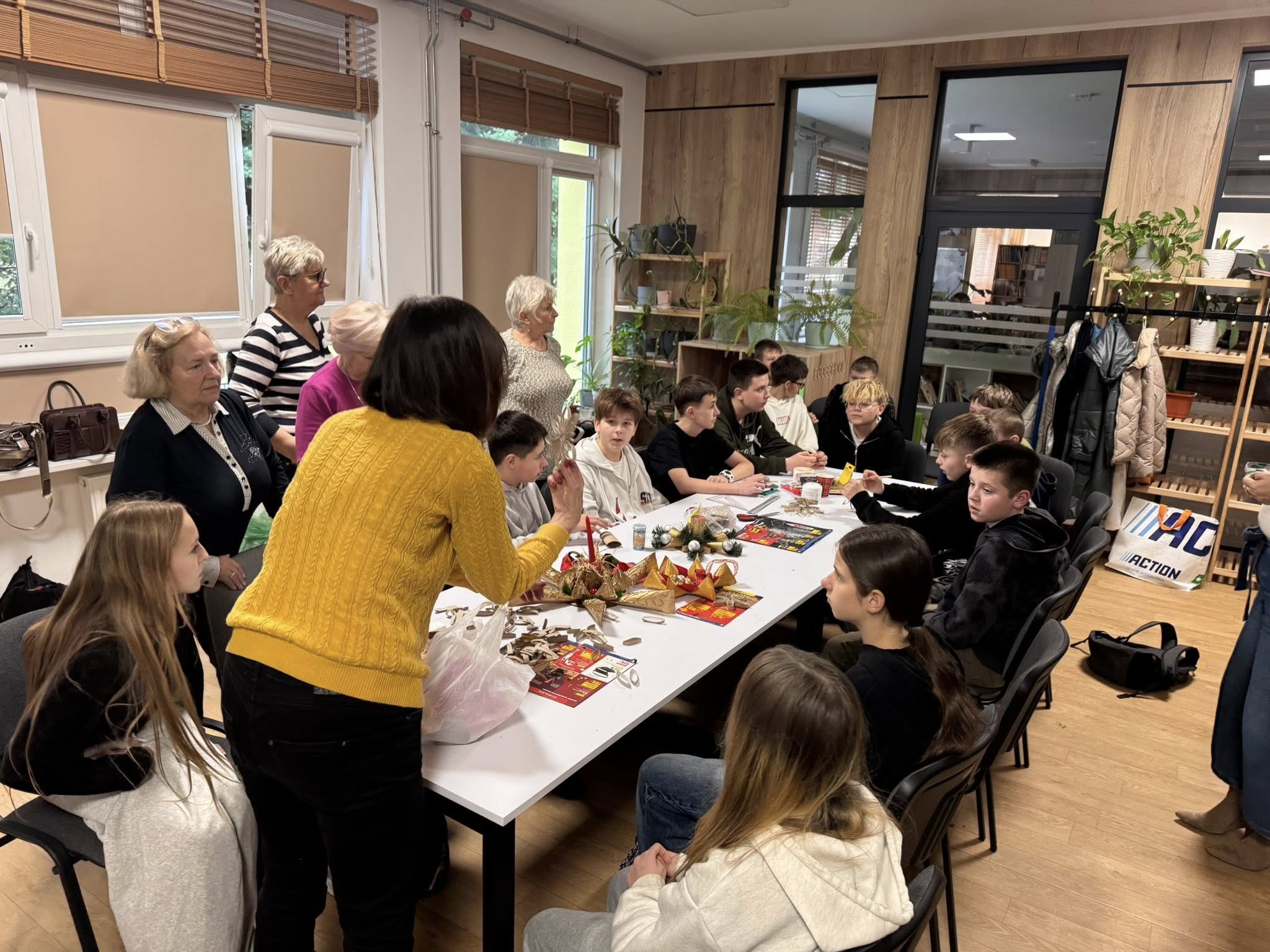 Wczoraj uczniowie klas: 6b i 7b, a dziś 5b i 1a tworzyli przepiękne stroiki i ozdoby świąteczne z surowców wtórnych. Wykorzystywali rolki po ręcznikach papierowych, papierze toaletowym, sznurki, papier i oczywiście różnego rodzaju ozdoby. Nie byłoby to możliwe, gdyby nie pomoc członkiń zaprzyjaźnionej sekcji „Niespokojne ręce” z Uniwersytetu Trzeciego Wieku ze Starachowic z panią Joanną Wójcik na czele. Panie przyjęły zaproszenie naszej wicedyrektor szkoły Agnieszki Pachockiej na wspólne warsztaty tworzenia ekoozdob świątecznych. Podczas tej niezwykłej lekcji ekologii, połączonej z tradycjami bożonarodzeniowymi panowała niezwykle miła i twórcza atmosfera. Uczniowie chętnie uczestniczyli w zajęciach, które tym razem nie były prowadzone przez nauczyciela naszej szkoły, ale przez niezwykle utalentowane słuchaczki UTW.