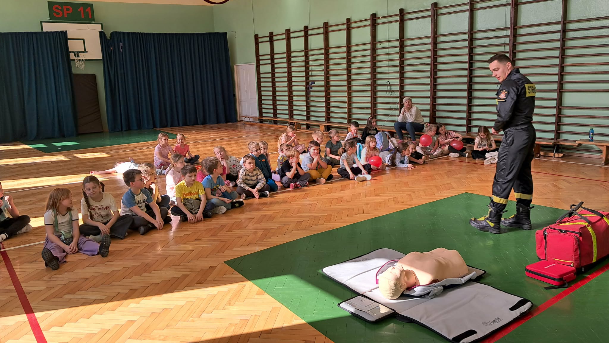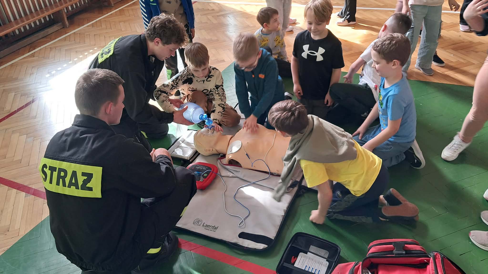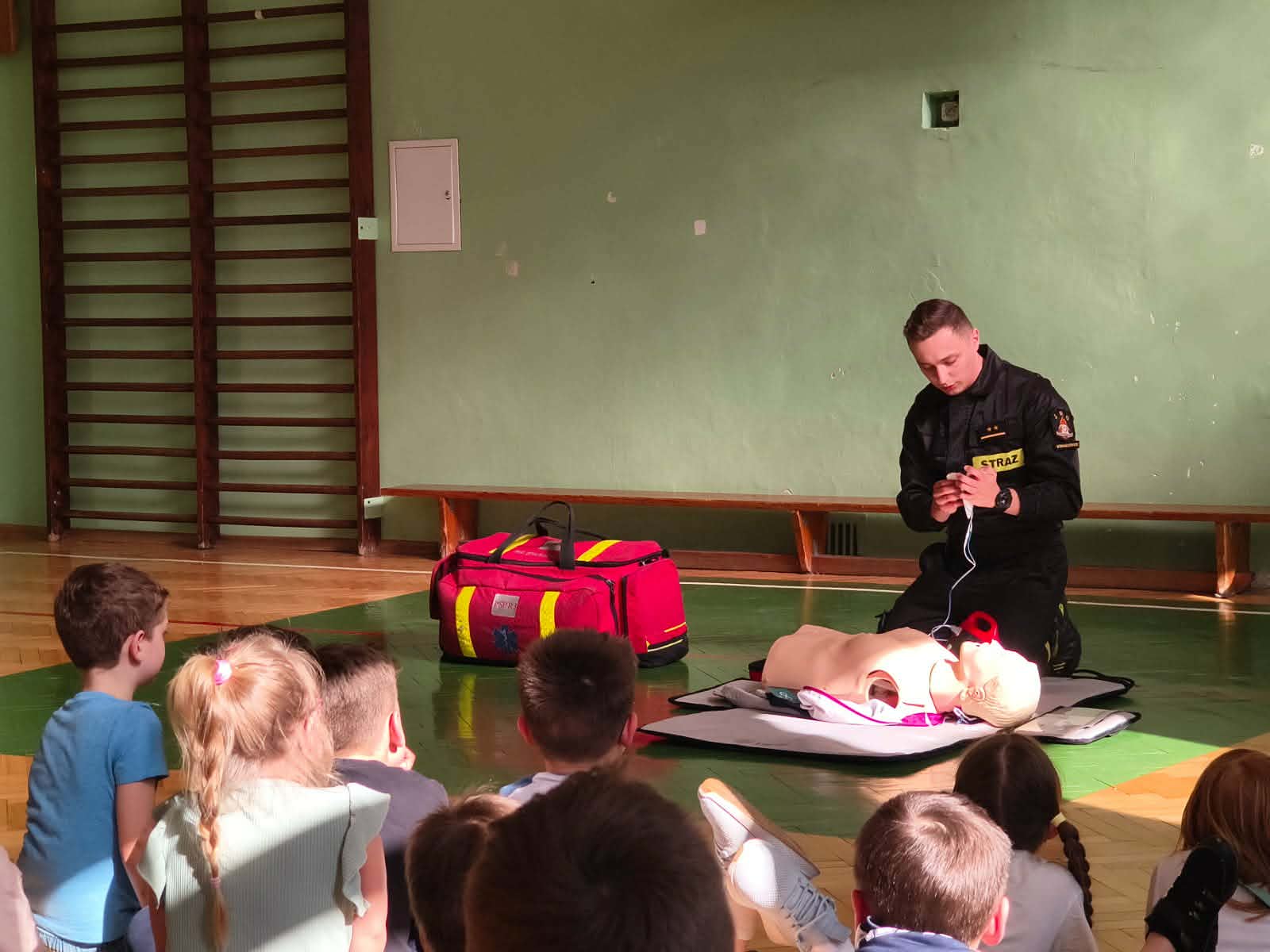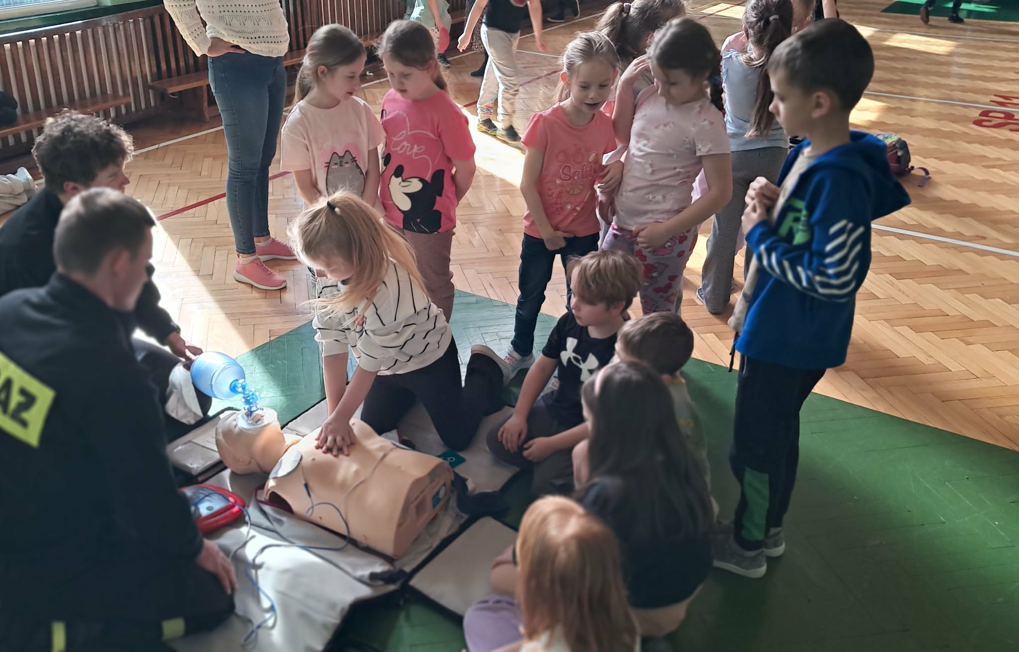 Spotkanie ze strażakami dla dzieci ze świetlicy szkolnej było okazją do poznania podstaw pierwszej pomocy w prosty i zrozumiały sposób. Strażacy opowiadali, jak ważne jest zachowanie spokoju i szybkie wezwanie pomocy, gdy ktoś potrzebuje wsparcia. Dzieci uczyły sie, jak sprawdzić czy osoba oddycha, jak ułożyć ją w pozycji bezpiecznej oraz kiedy dzwonić pod numer alarmowy 112. Strażacy pokazali też, jak wygląda resuscytacja na fantomie i pozwolili uczniom spróbować swoich sił. Dzięki temu spotkaniu dzieci dowiedziały się, że każdy- nawet najmłodszy- może pomóc drugiemu człowiekowi.