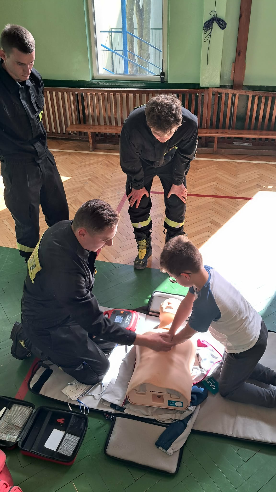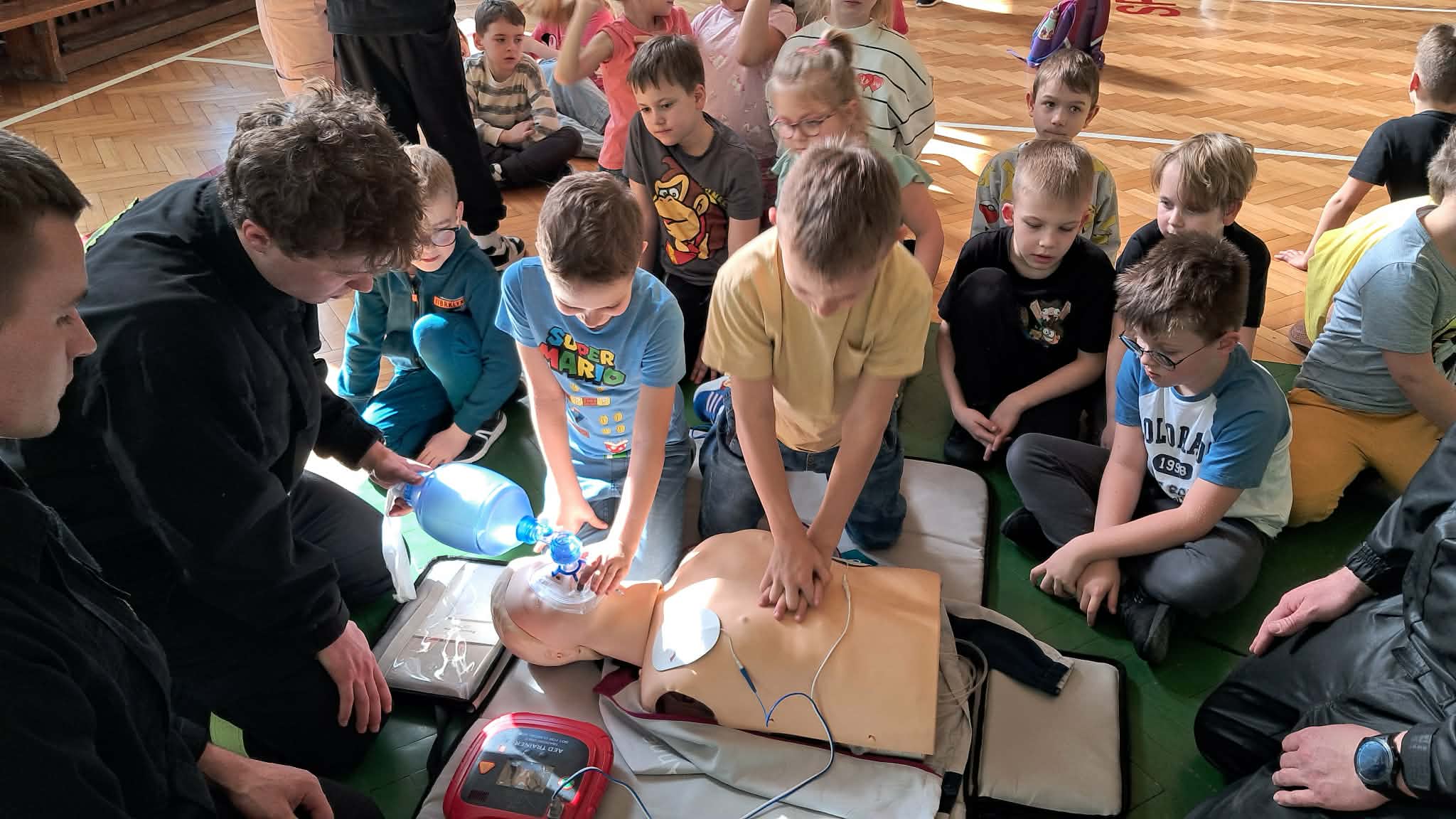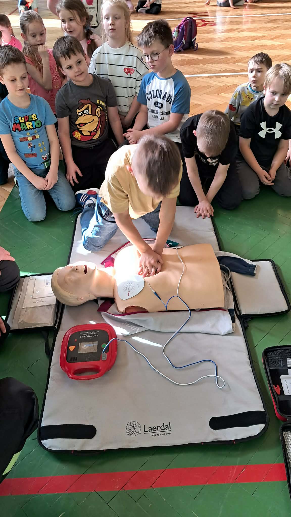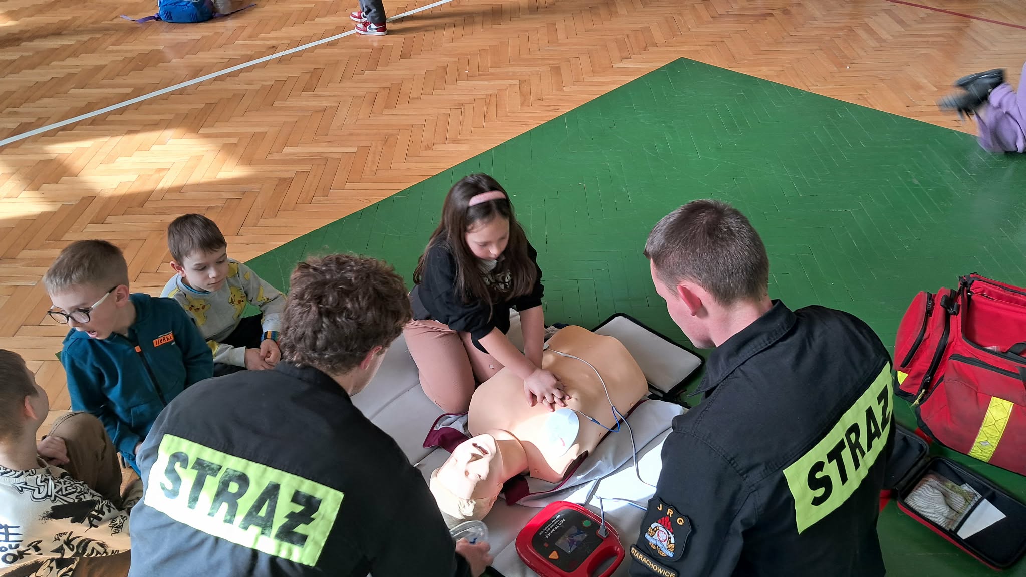 Spotkanie ze strażakami dla dzieci ze świetlicy szkolnej było okazją do poznania podstaw pierwszej pomocy w prosty i zrozumiały sposób. Strażacy opowiadali, jak ważne jest zachowanie spokoju i szybkie wezwanie pomocy, gdy ktoś potrzebuje wsparcia. Dzieci uczyły sie, jak sprawdzić czy osoba oddycha, jak ułożyć ją w pozycji bezpiecznej oraz kiedy dzwonić pod numer alarmowy 112. Strażacy pokazali też, jak wygląda resuscytacja na fantomie i pozwolili uczniom spróbować swoich sił. Dzięki temu spotkaniu dzieci dowiedziały się, że każdy- nawet najmłodszy- może pomóc drugiemu człowiekowi.