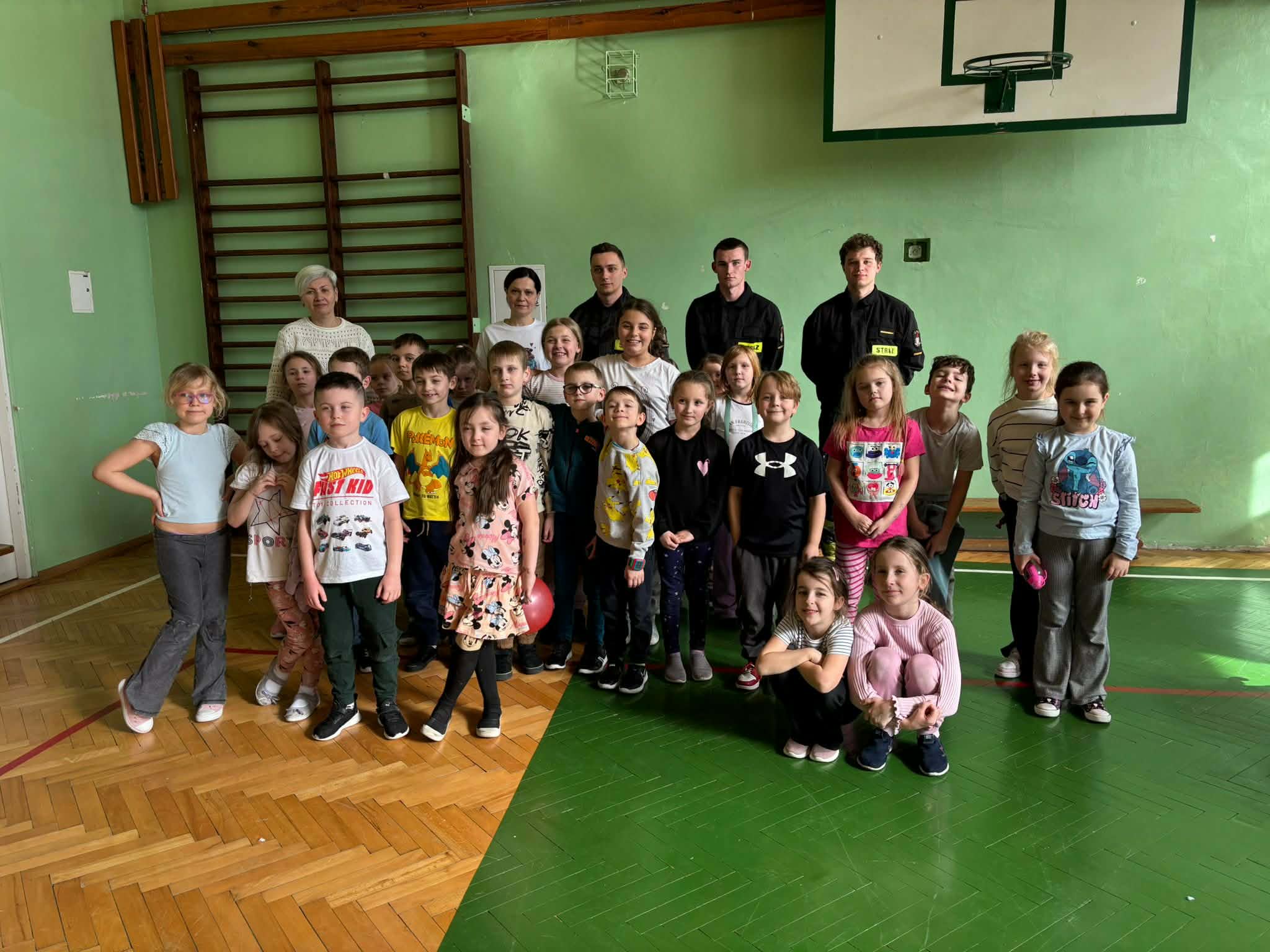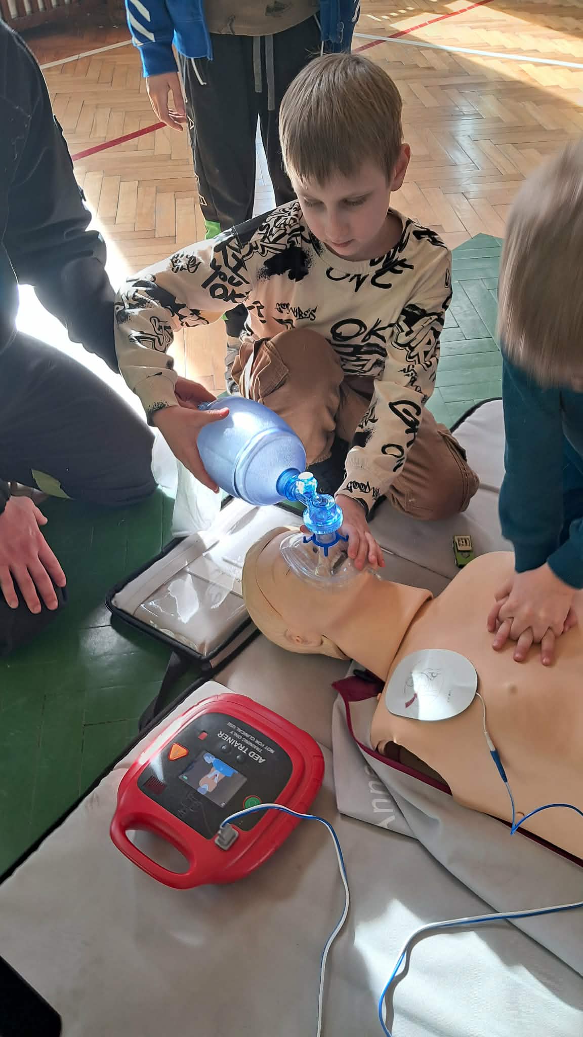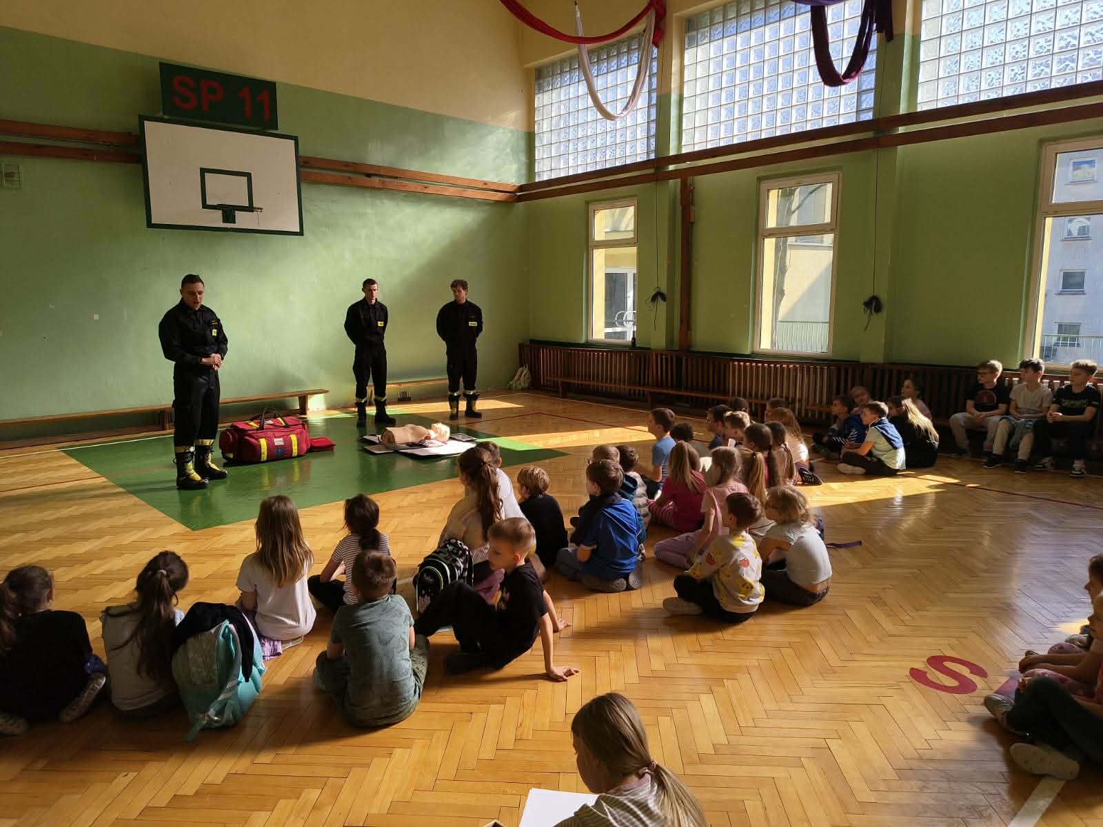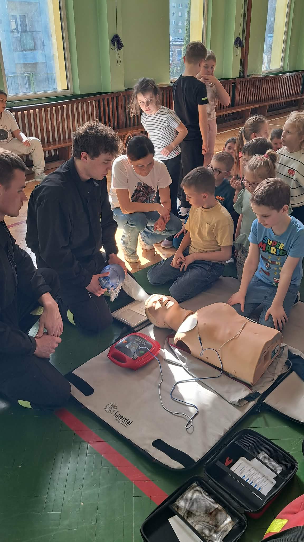 Spotkanie ze strażakami dla dzieci ze świetlicy szkolnej było okazją do poznania podstaw pierwszej pomocy w prosty i zrozumiały sposób. Strażacy opowiadali, jak ważne jest zachowanie spokoju i szybkie wezwanie pomocy, gdy ktoś potrzebuje wsparcia. Dzieci uczyły sie, jak sprawdzić czy osoba oddycha, jak ułożyć ją w pozycji bezpiecznej oraz kiedy dzwonić pod numer alarmowy 112. Strażacy pokazali też, jak wygląda resuscytacja na fantomie i pozwolili uczniom spróbować swoich sił. Dzięki temu spotkaniu dzieci dowiedziały się, że każdy- nawet najmłodszy- może pomóc drugiemu człowiekowi.