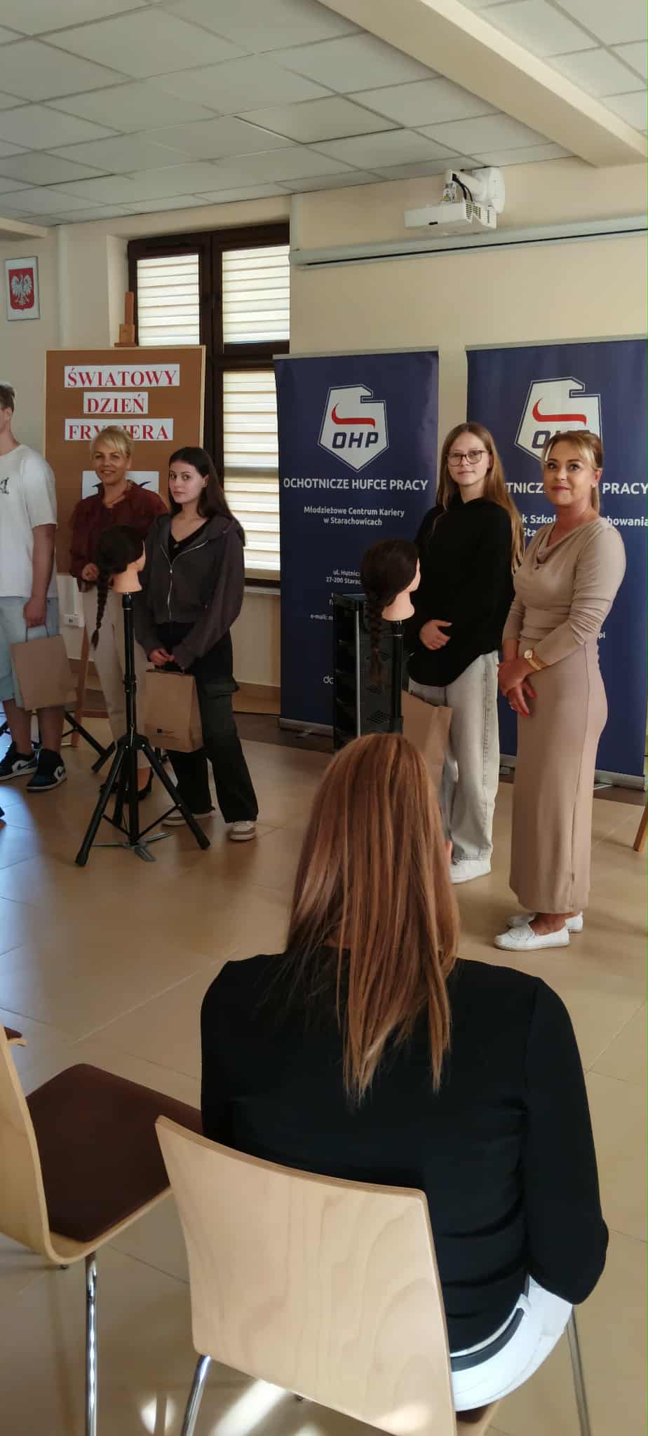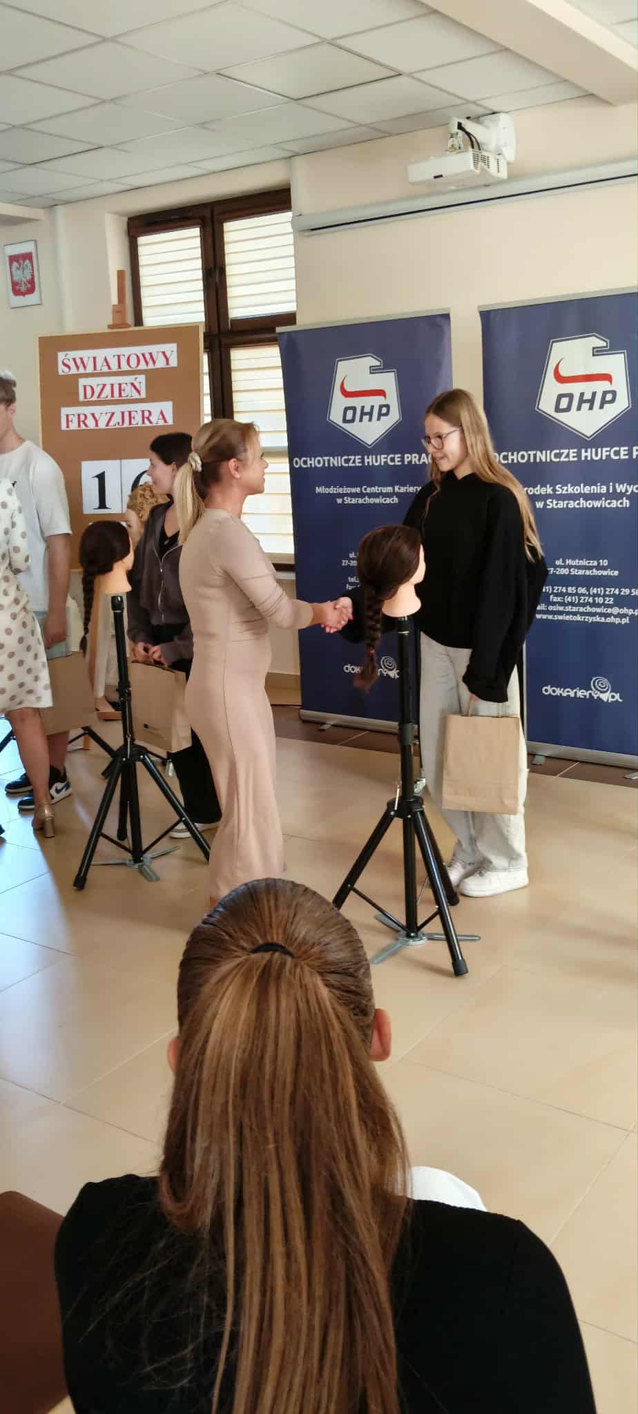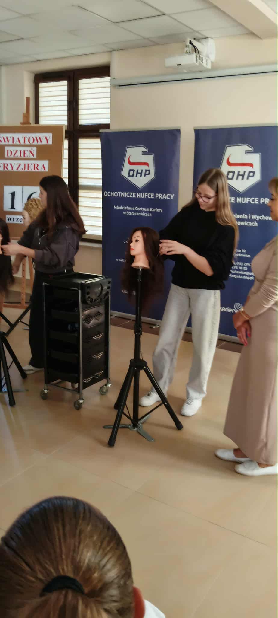 Uczniowie klasy 8ai i 7dw uczestniczyli w Światowym Dniu Fryzjera zorganizowanym przez Świętokrzyską Wojewódzką Komendę OHP w Kielcach i Młodzieżowe Centrum Kariery w Starachowicach. Spotkanie odbyło się w budynku OHP w Starachowicach. Celem przedsięwzięcia było budowanie świadomości podejmowania właściwych decyzji edukacyjno – zawodowych w oparciu o wiedzę o danym zawodzie przez młodzież. Uczniowie poznali historię zawodu fryzjer, obejrzeli fryzury z różnych epok, uczestniczyli w konkursie na najlepsze wykonanie fryzury, a dziewczęta miały okazję wziąć udział w stylizacji fryzur wykonanych przez praktykantów OHP. Uczestnicy zapoznali się z ofertą OHP w Starachowicach, zwiedzili pracownie: mechaniczną, gastronomiczną.